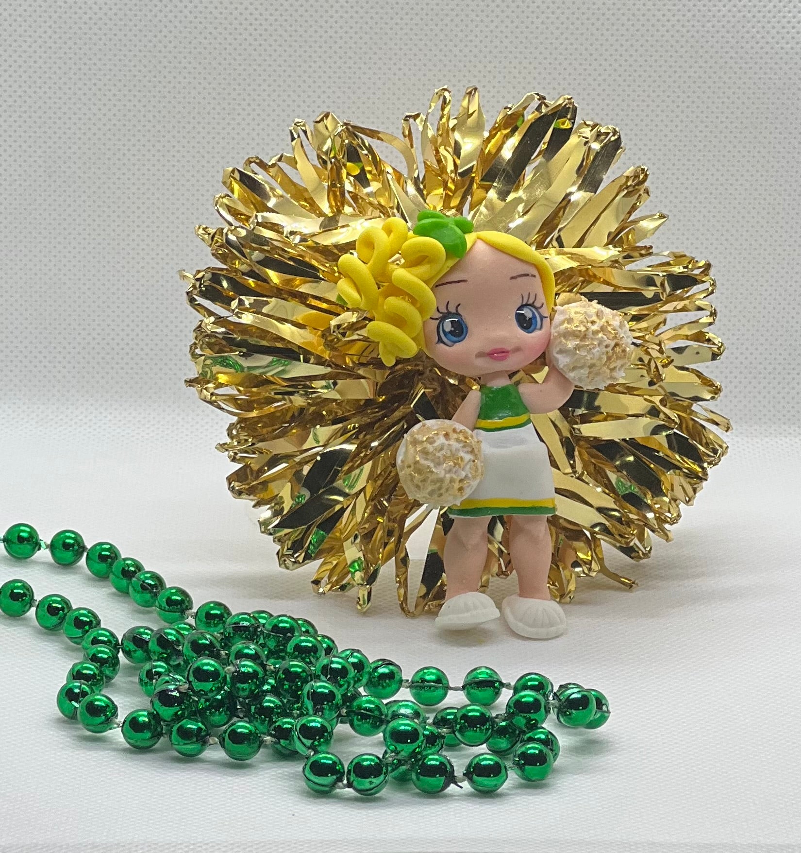 Pre-made custom 3-inch Cheerleader Clay Figurine with green, yellow and white uniform, blonde hair, blue eyes and white and gold pom poms